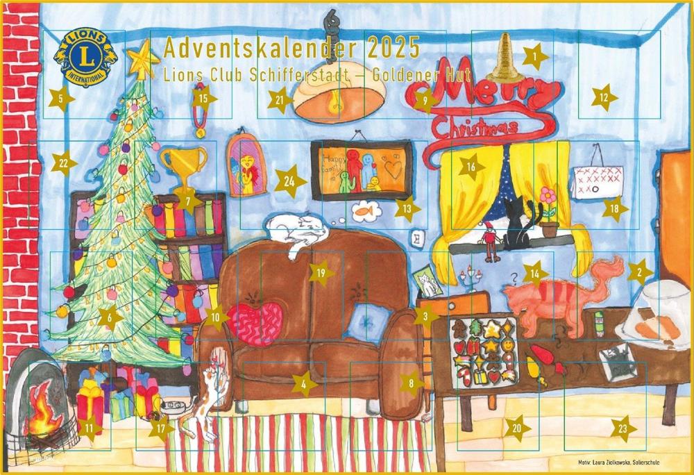 Auch der Lions Adventskalender für Schifferstadt um Umland bildet ein zusätzliches Standbein, um weitere Spenden zu generieren. Wir werden diesen nach der sehr positiven Resonanz auch im neuen Jahr wieder auflegen. Melden Sie sich gerne bei uns (Link "Kontakt" ganz unten auf der Website), wenn Sie frühzeitig eine größe Zahl von Adventskalendern für ihr Unternehmen, Team, etc. vorbestellen möchten, da der Kalender in diesem Jahr schnell vergriffen war.