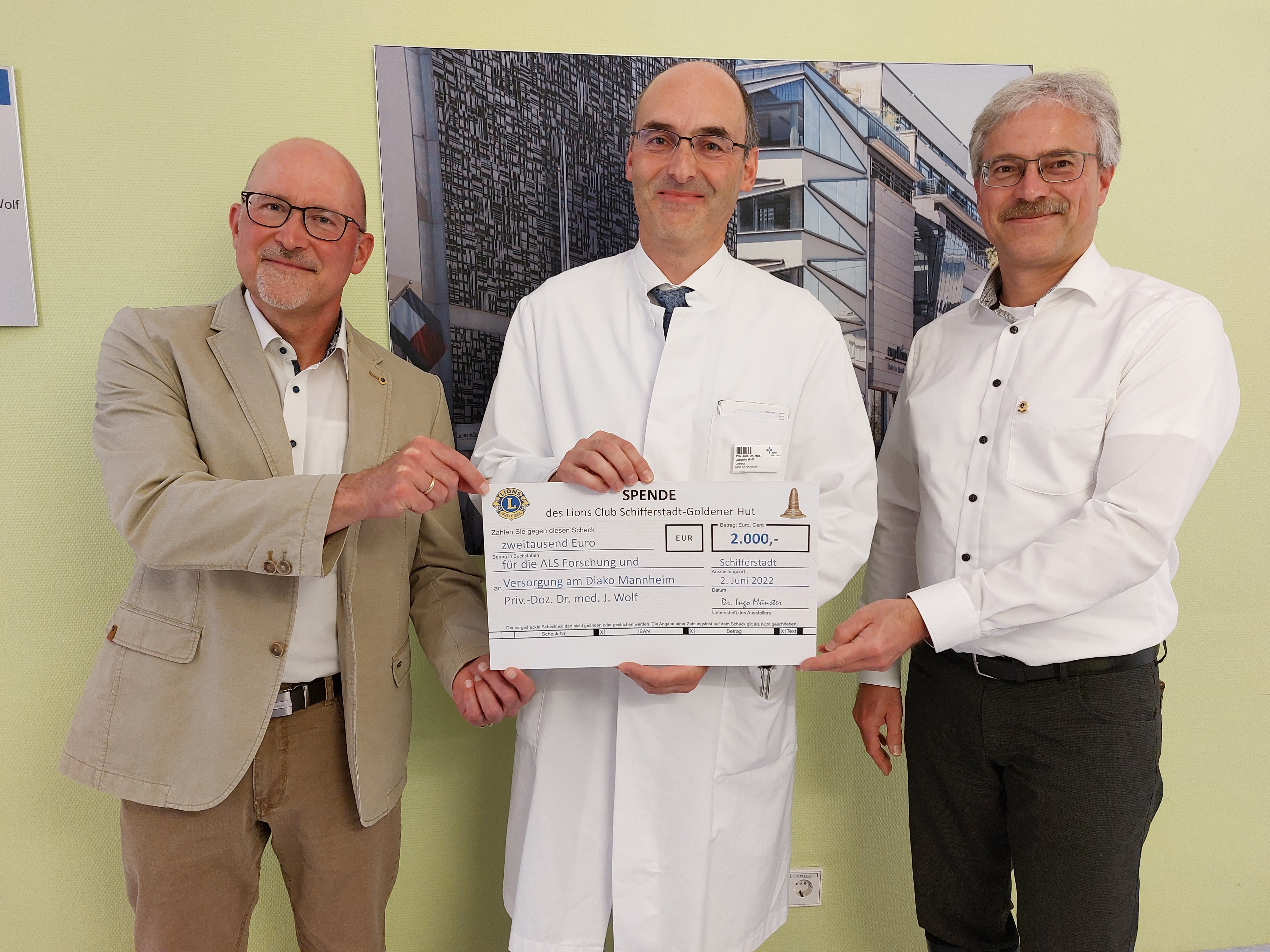 Aufmerksam auf dieses gravierende Krankheitsbild wurden die Mitglieder des Lions Clubs in Schifferstadt aufgrund der Erfahrung eines Patienten aus den eigenen Reihen. „Jährlich erkranken allein in Deutschland ca. 2.000 Patienten neu an ALS. Ganz wichtig ist die möglichst frühzeitige Diagnose berichtet der Chefarzt der Neurologie am Diako Mannheim. Daher arbeiten die Spezialisten an den rund 20 Schwerpunktzentren in Deutschland gut vernetzt zusammen. Gerade ohne heilende Therapie ist eine engmaschige Betreuung der Patienten und Angehörigen bei dieser Krankheit mit ihren komplexen Herausforderungen von größter Bedeutung. Die Spende des Lions Clubs ist daher sehr willkommen, freut sich Priv.-Doz. Dr. Wolf. Sie soll die wichtige Arbeit am ALS-Register für Rheinland-Pfalz unterstützen, und zudem helfen, das Krankheitsbild bekannter zu machen.